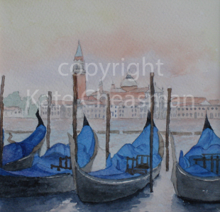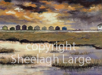 Beach Hut Morning, a watercolour by Sheelagh Large.